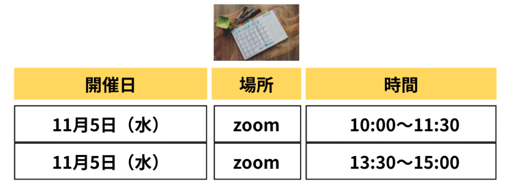 ※どの日程も同じ内容です。ご都合のよい日時にお越しください。